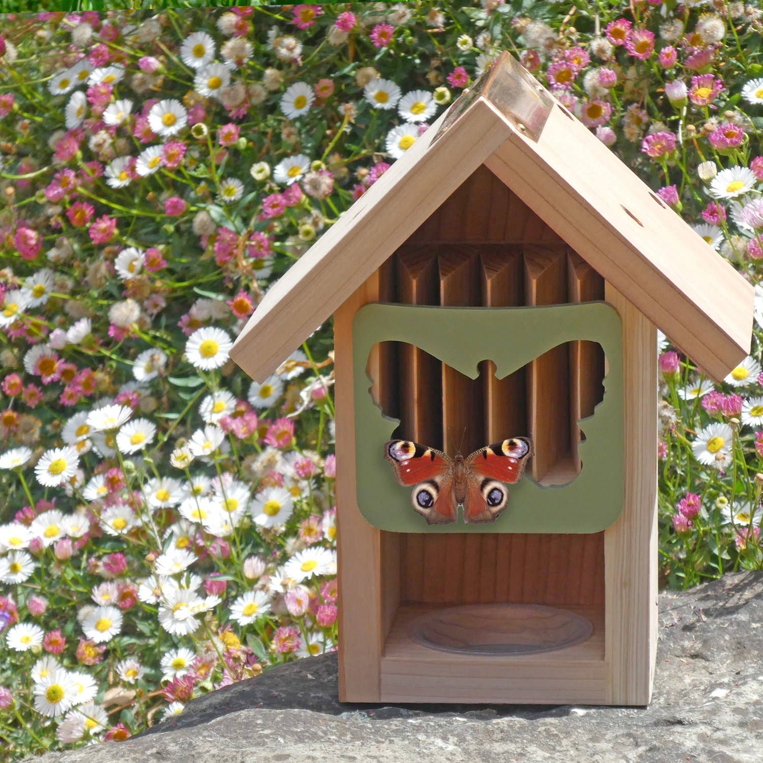 Feed & provide shelter for butterflies in your garden with our new Butterfly Barn. Part of our new Barn Range. The Butterfly Barn provides a safe home for all types of butterflies, moths and lacewings. Designed not only for butterflies but also many other species of pollinating insects. The slatted centre provides resting and sheltering spots. The Barn’s recycled plastic door swivels, allowing access to the nesting compartment to clean and carefully observe species during cooler weather. For feeding fill up the reservoir at the bottom with a solution of butterfly food. Serve sweet over-ripe fruit instead of sugar water. Produced from sustainably managed, FSC-certified wood, with a recycled second-life plastic front. The Butterfly Barn is easy to put up and care for. Size Approx 20.5 x 17 x 10.5 cm